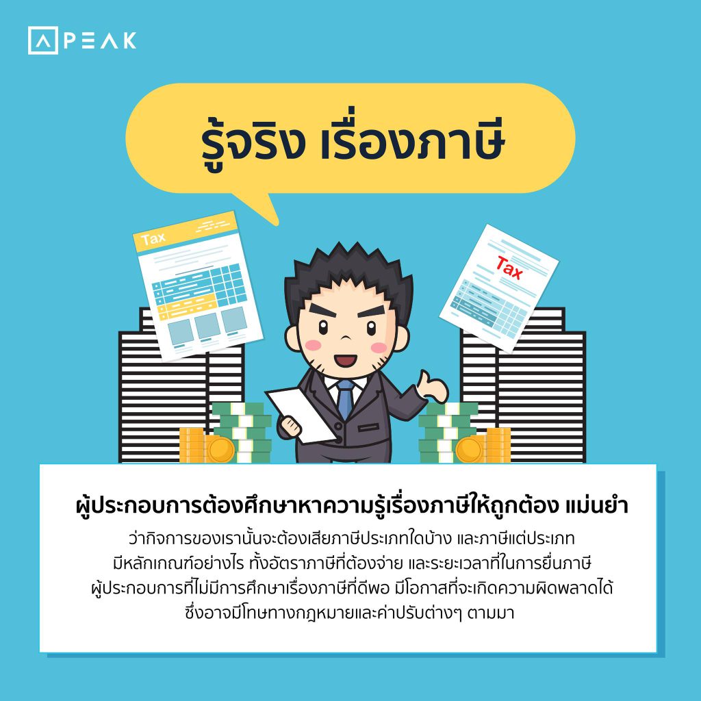 เรื่องสำคัญประการแรกที่ผู้ประกอบการต้องทำ ก็คือการศึกษาหาความรู้เรื่องภาษี ว่ากิจการของเรานั้นจะต้องเสียภาษีประเภทใดบ้าง และภาษีแต่ประเภทมีหลักเกณฑ์อย่างไร ทั้งอัตราภาษีที่ต้องจ่าย และระยะเวลาที่ในการยื่นภาษี เช่น ภาษีเงินได้นิติบุคคล ภาษีมูลค่าเพิ่ม ภาษีหัก ณ ที่จ่าย ภาษีธุรกิจเฉพาะ อากรแสตมป์ เป็นต้น ซึ่งหากผู้ประกอบการไม่มีการศึกษาเรื่องภาษีที่ดีพอ ก็มีโอกาสที่จะเกิดความผิดพลาดได้สูง ซึ่งอาจมีโทษทางกฎหมายและค่าปรับต่างๆ ตามมา